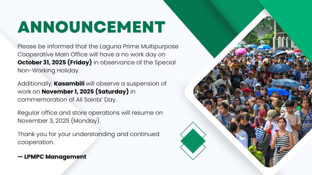 📢 Official Announcement In observance of the upcoming holidays, please be informed that there will be a suspension of work at the Laguna Prime Multipurpose Cooperative Main Office on October 31, 2025 (Friday), as the day has been declared a Special Non-Working Holiday. Furthermore, our Kasambili store will also observe a suspension of work on November 1, 2025 (Saturday) in commemoration of All Saints’ Day. All regular office and store operations will resume on November 3, 2025 (Monday). We encourage our members and clients to plan their transactions accordingly.Thank you for your kind understanding and continued support. — Laguna Prime Multipurpose Cooperative Management