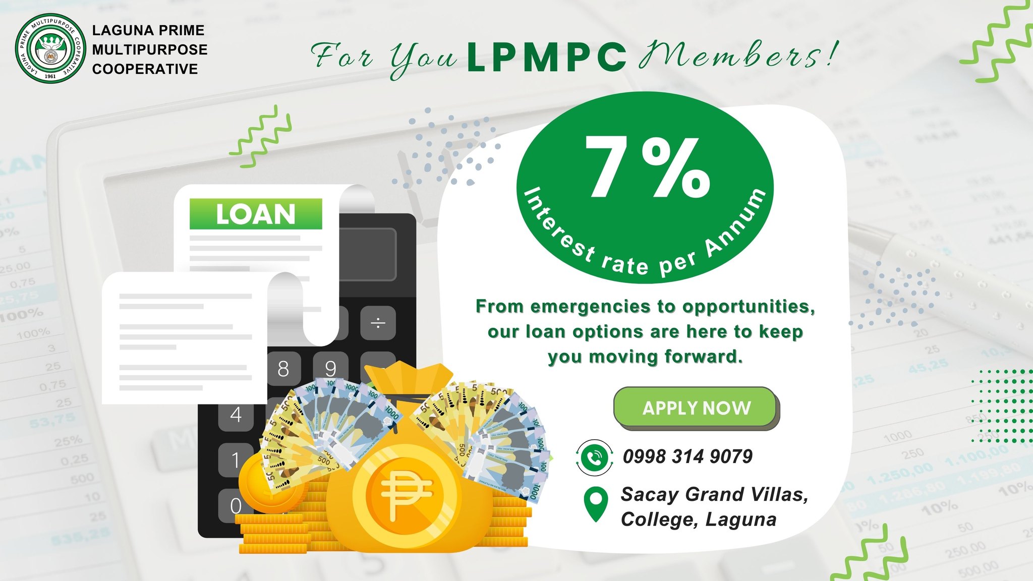Laguna Prime Multipurpose Cooperative (LPMPC) continues to empower its members by providing affordable and accessible loan opportunities designed to support both personal and financial needs. With a competitive 7% interest rate per annum, our loan program ensures that members can manage emergencies, pursue opportunities, or meet important financial goals with greater ease and security.