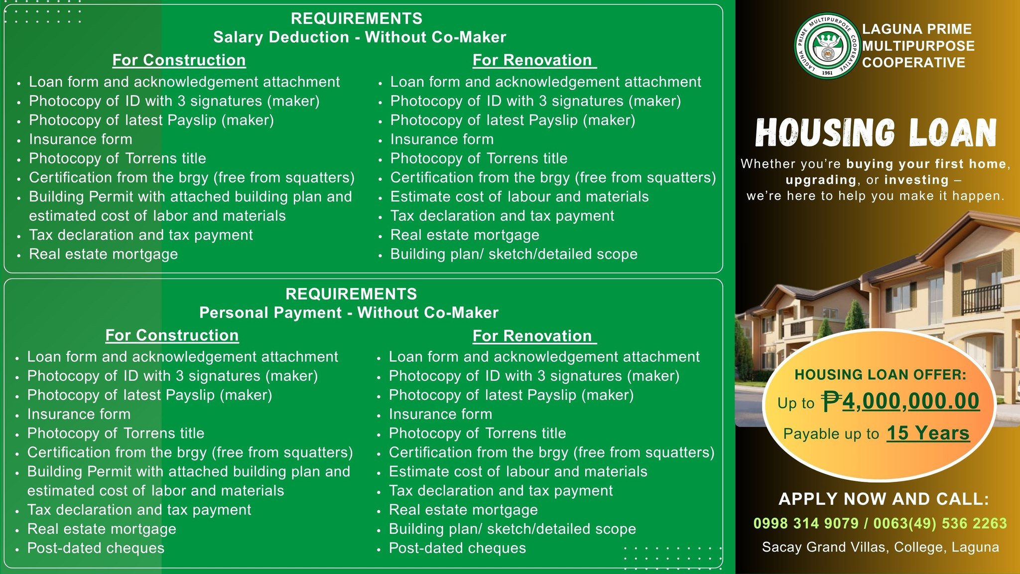 Owning your dream home or upgrading your current one is now within reach with the Housing Loan from Laguna Prime Multipurpose Cooperative. Whether you’re planning to construct a new house, renovate your existing home, or invest in property, we’re here to provide the financial support you need. With a loan offer of up to ₱4,000,000.00 and flexible repayment terms of up to 15 years, you can confidently take the next step toward securing your family’s future. With simple requirements and flexible options, you can now achieve your housing goals with ease. Laguna Prime MPC – Helping You Build a Better Home, One Step at a Time.