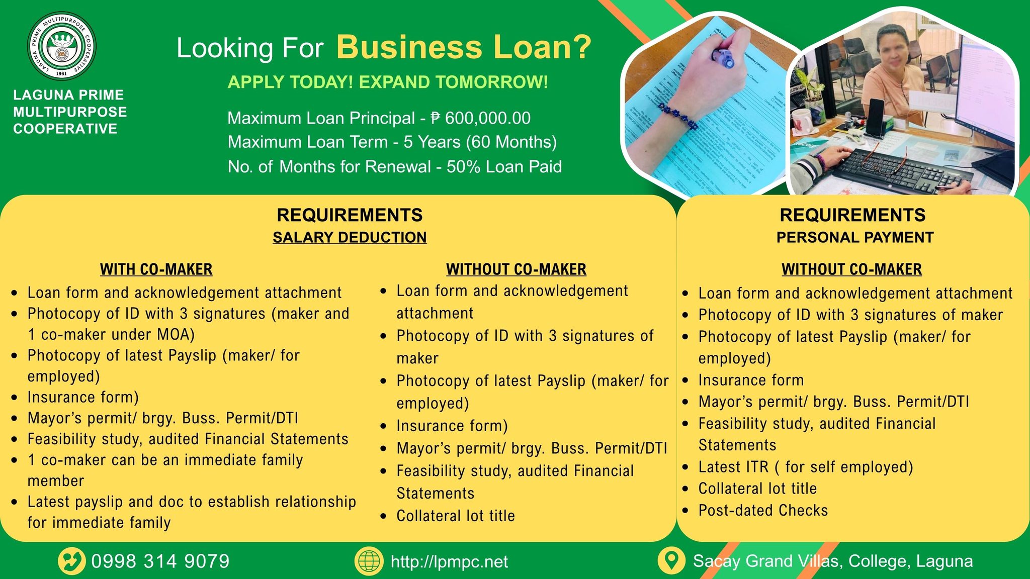 Growing a business requires not just passion and hard work, but also financial support. At Laguna Prime Multipurpose Cooperative (LPMPC), we’re here to help entrepreneurs and business owners achieve their goals with our Business Loan Program.