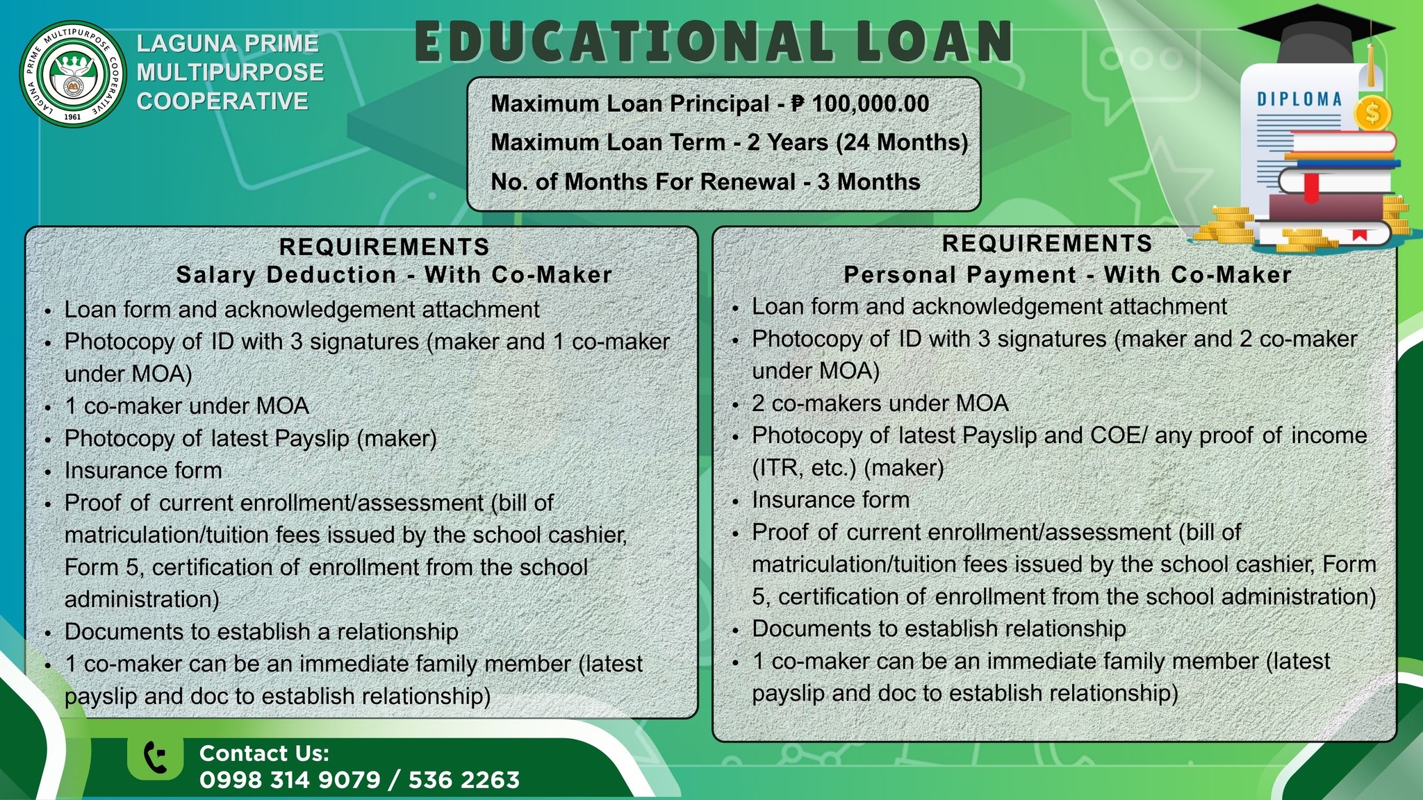With a maximum loan principal of ₱100,000.00 and a flexible loan term of up to 2 years (24 months), members can focus on their studies without worrying about overwhelming costs. For added flexibility, loans are renewable every 3 months.