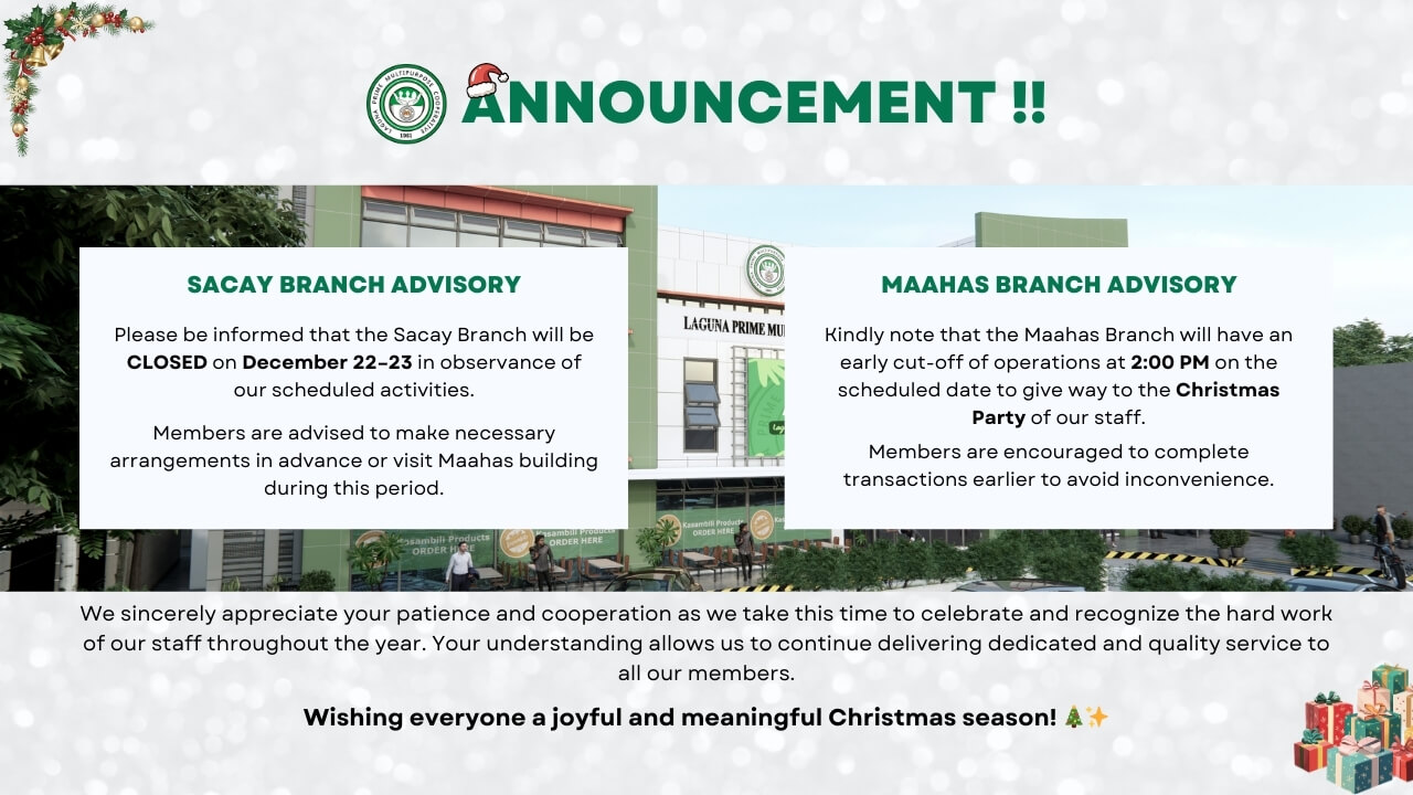 Kindly note that the Maahas Branch will have an early cut-off of operations at 2:00 PM on the scheduled date to give way to the Christmas Party of our staff.