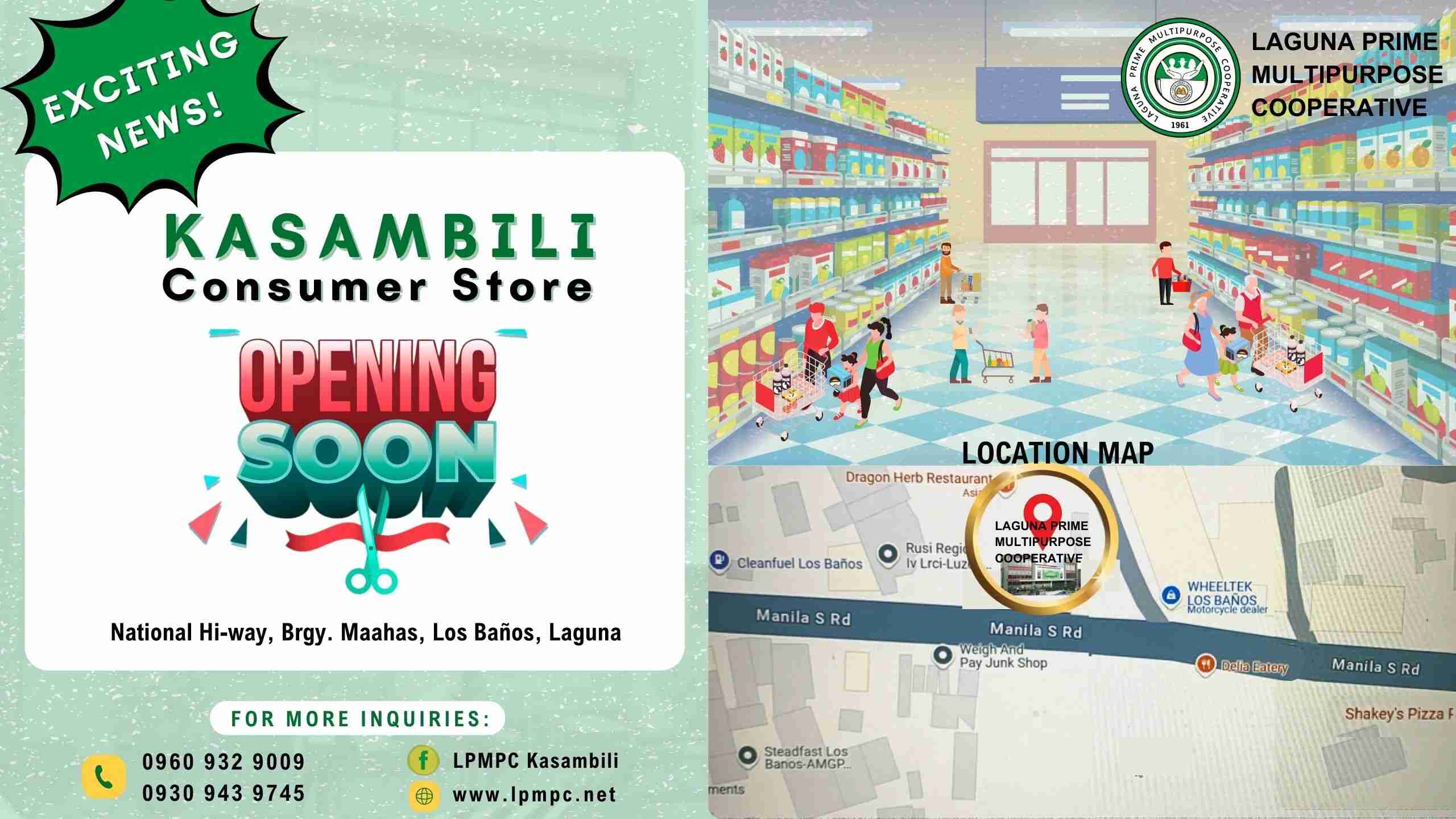 Kasambili Consumer Store, an exciting new venture by the Laguna Prime Multipurpose Cooperative (LPMPC), will be opening soon at its new location on the National Highway, Brgy. Maahas, Los Baños, Laguna. The store will operate in the newly built LPMPC headquarters, strategically located for accessibility and convenience. The soft opening is set for February 24, 2025, Monday, marking a significant milestone for LPMPC and the local community. Kasambili aims to provide a wide range of quality consumer goods, ensuring a pleasant and rewarding shopping experience for all its members and customers. For more inquiries, contact LPMPC through the provided phone numbers or visit their website and social media pages for updates.
