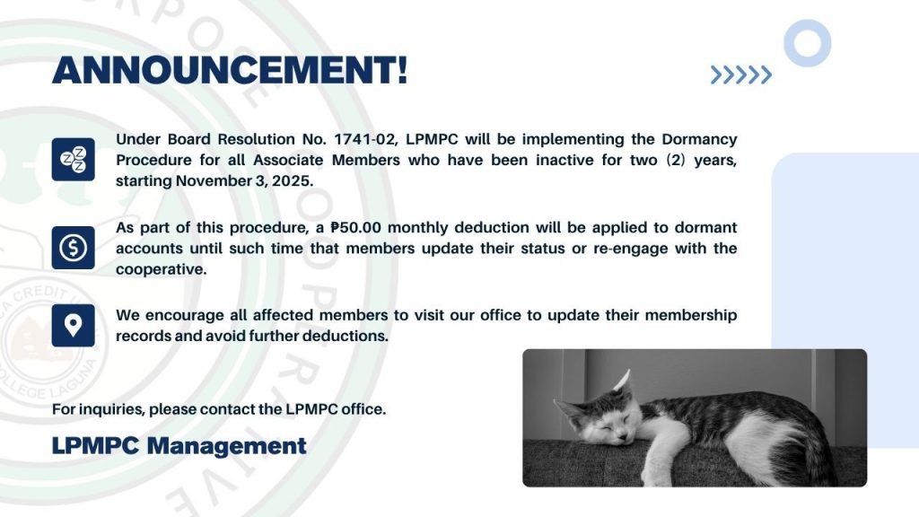 In line with Board Resolution No. 1741-02, the Laguna College Employees Multi-Purpose Cooperative (LPMPC) will roll out its Dormancy Procedure effective November 3, 2025. This policy applies to Associate Members who have been inactive for two (2) years, ensuring that all membership records remain up-to-date and properly maintained. As part of the procedure, a ₱50.00 monthly deduction will be charged to dormant accounts until members update their records or re-engage with the cooperative. To avoid these deductions, LPMPC encourages affected members to visit the office and update their membership details promptly. This initiative reinforces the cooperative’s commitment to transparency, accountability, and member engagement. For further inquiries or assistance, members are advised to contact the LPMPC office directly.