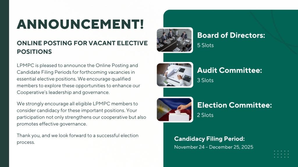 ANNOUNCEMENT! ONLINE POSTING FOR VACANT ELECTIVE POSITIONS LPMPC is pleased to announce the Online Posting and Candidate Filing Periods for forthcoming vacancies in essential elective positions. We encourage qualified members to explore these opportunities to enhance our Cooperative’s leadership and governance. We strongly encourage all eligible LPMPC members to consider candidacy for these important positions. Your participation not only strengthens our cooperative but also promotes effective governance. Thank you, and we look forward to a successful election process. Board of DIrectors: 5 slots Audit Committee: 3 slots Election Committee: 2 slots Eligible members are invited to submit their candidacy applications within the filing period. We encourage everyone willing to contribute their expertise, leadership, and commitment to step forward and take part in the Cooperative’s continued progress.