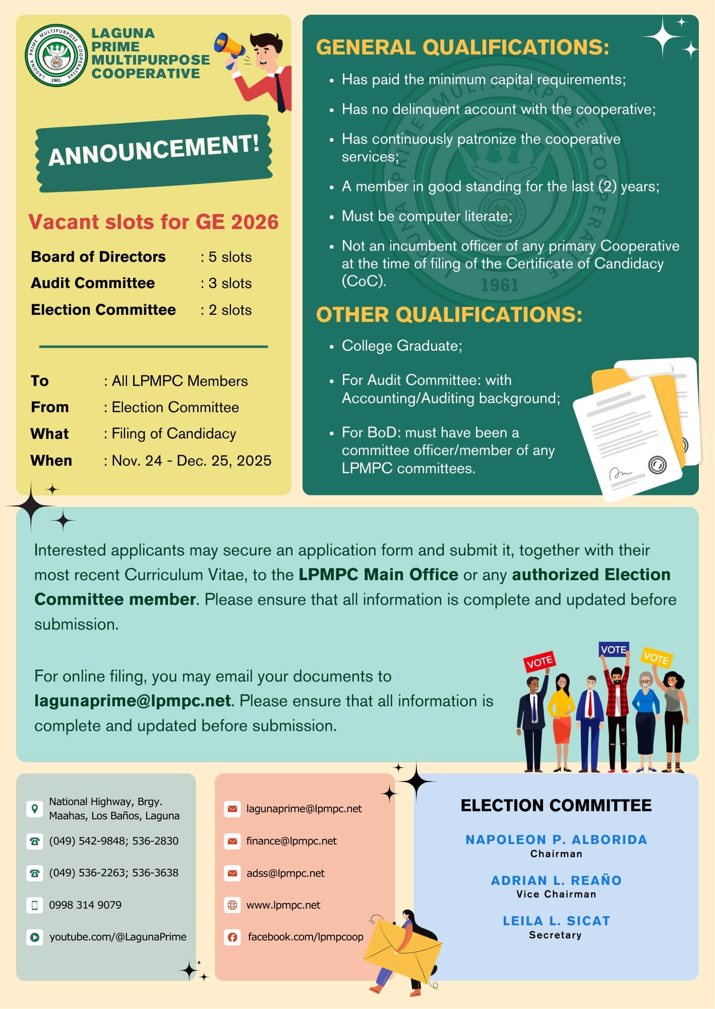 The Laguna Prime Multipurpose Cooperative (LPMPC) Election Committee is calling on all eligible members to file their Certificate of Candidacy for the General Election (GE) 2026. This is a crucial opportunity for members to take on a leadership role and help steer the cooperative’s future. The filing period is currently open, running from November 24 to December 25, 2025.