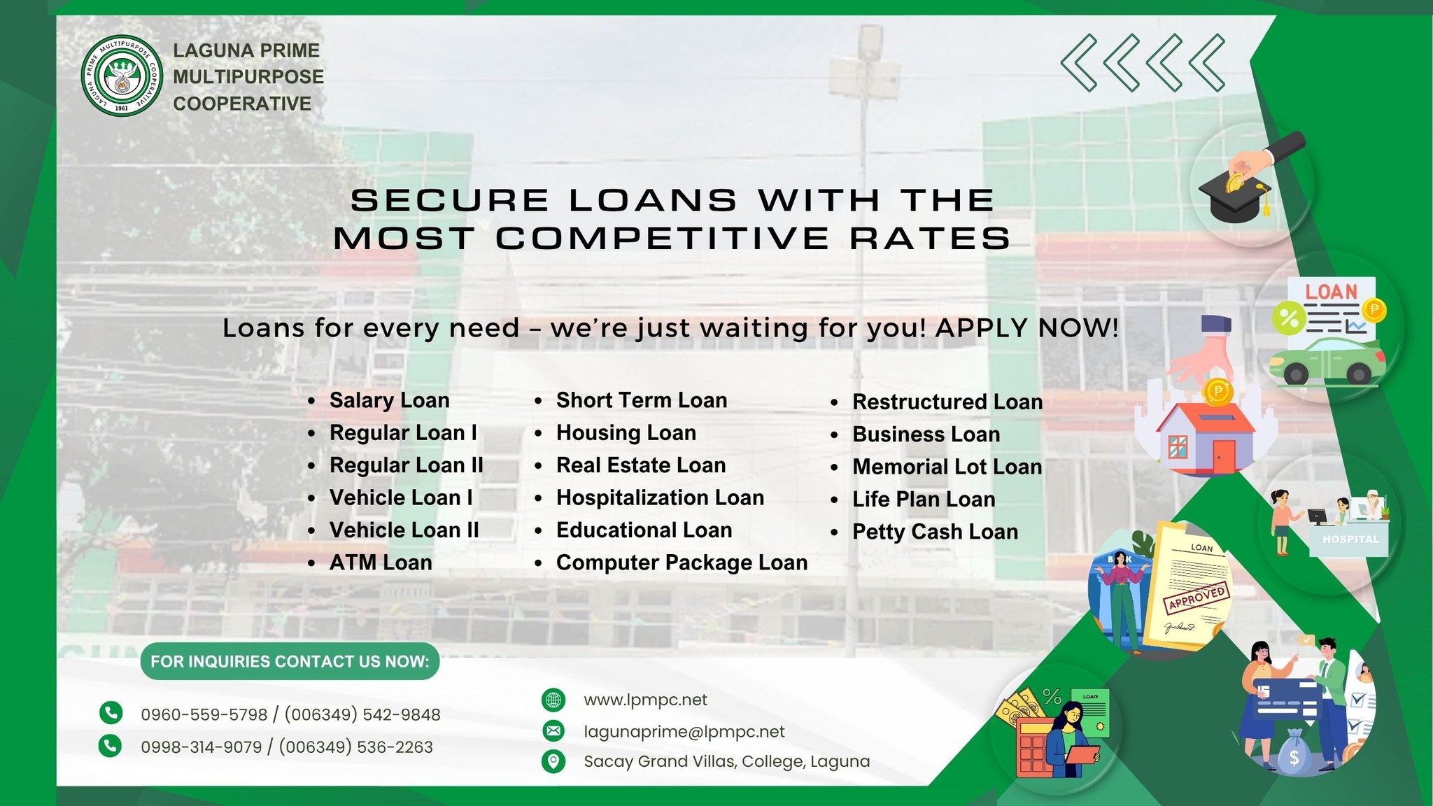 Laguna Prime Multipurpose Cooperative offers a wide range of secure and affordable loan solutions tailored to meet the financial needs of its members. With competitive interest rates and flexible terms, members can conveniently access funds for personal, business, educational, medical, or emergency purposes.