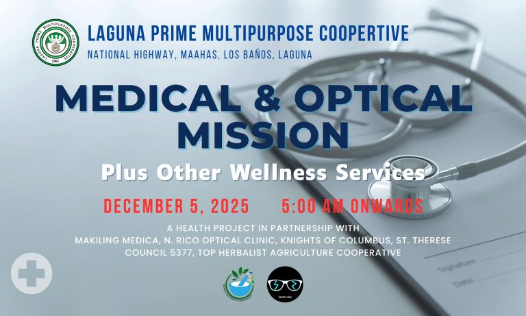 Join Laguna Prime Multipurpose Cooperative’s Medical & Optical Mission on February 24, 2025, from 5:00 AM to 12:00 NN in Maahas, Los Baños.