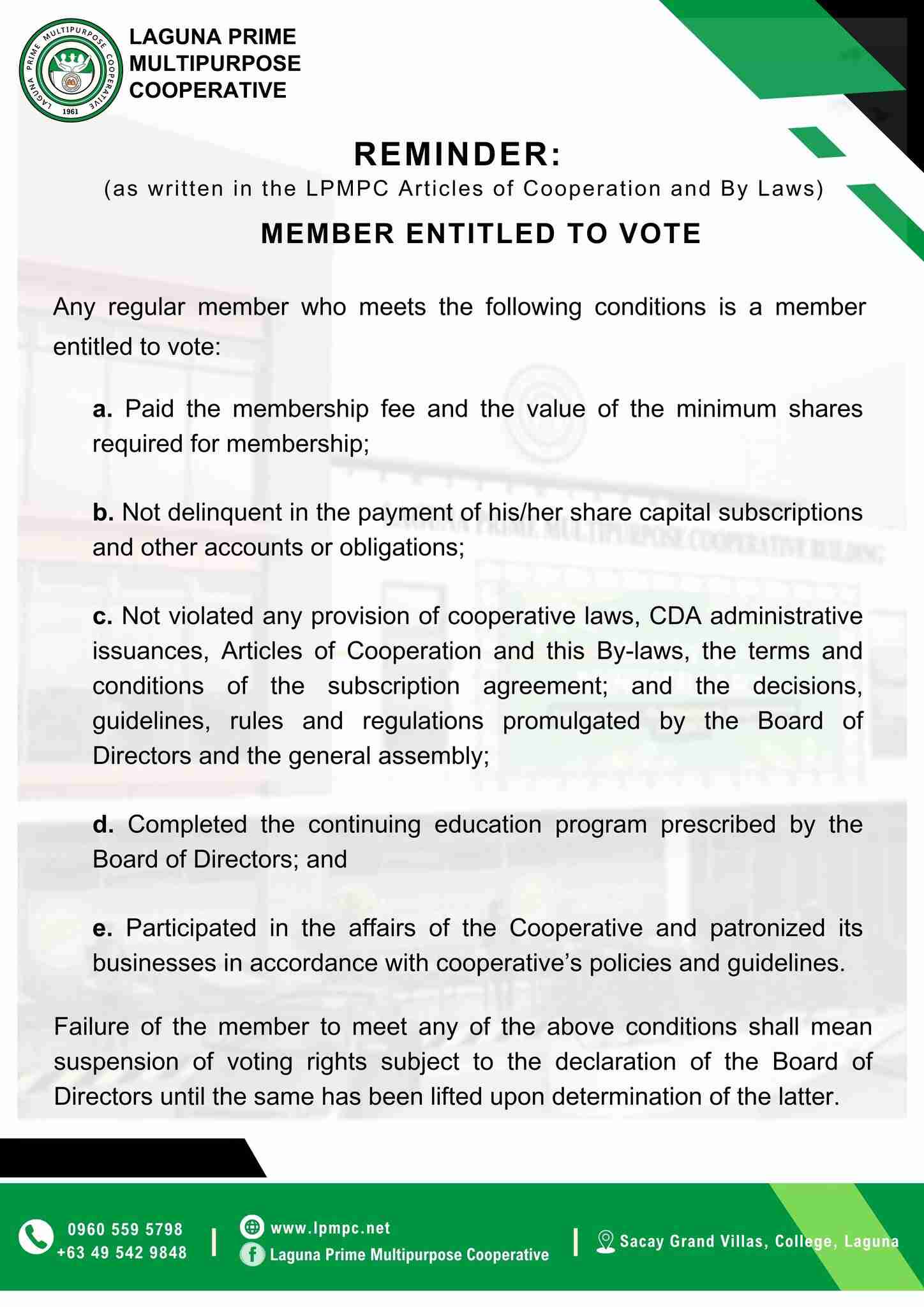 As stated in the LPMPC Articles of Cooperation and By-Laws, a regular member who meets the following conditions is entitled to vote: The member must have paid the membership fee and the value of the minimum shares required for membership. Additionally, they must not be delinquent in the payment of their share capital subscriptions and other accounts or obligations. They should not have violated any provision of cooperative laws, CDA administrative issuances, Articles of Cooperation, and By-laws, as well as the terms and conditions of the subscription agreement, or the decisions, guidelines, rules, and regulations promulgated by the Board of Directors and the general assembly. Furthermore, they must have completed the continuing education program prescribed by the Board of Directors and participated in the affairs of the Cooperative, patronizing its businesses in accordance with cooperative policies and guidelines.
