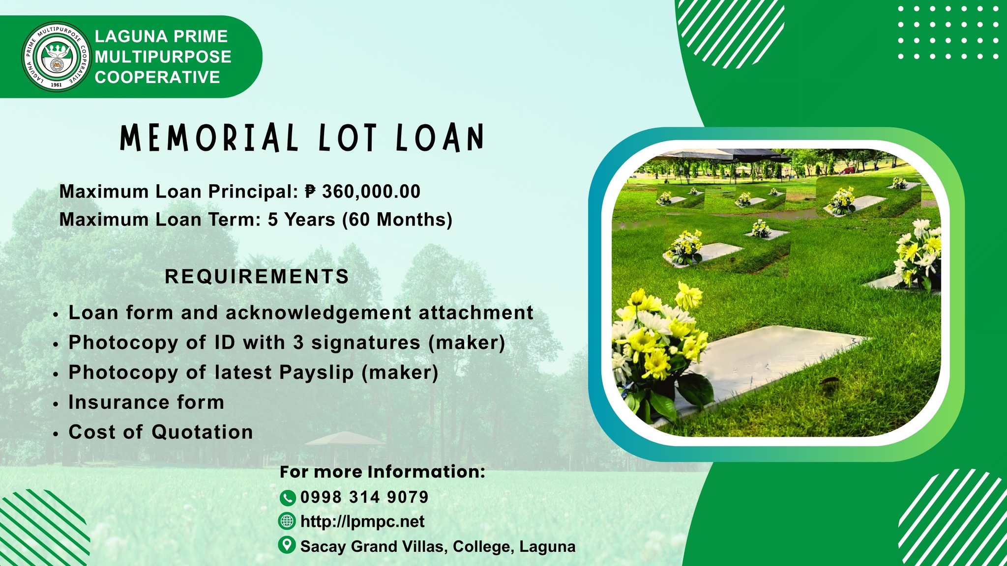 Planning ahead is one of the greatest gifts you can give your loved ones. With the Memorial Lot Loan from Laguna Prime Multipurpose Cooperative (LPMPC), you can secure a dignified and lasting place for the future—without the financial stress.
