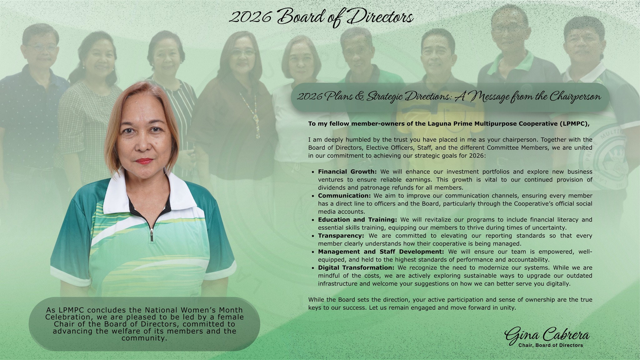 As we conclude the National Women’s Month celebration, Laguna Prime Multipurpose Cooperative proudly moves forward under the leadership of our Chairperson, Ms. Gina Cabrera. Guided by a clear vision for 2026, we remain committed to financial growth, transparency, and empowering every member-owner.