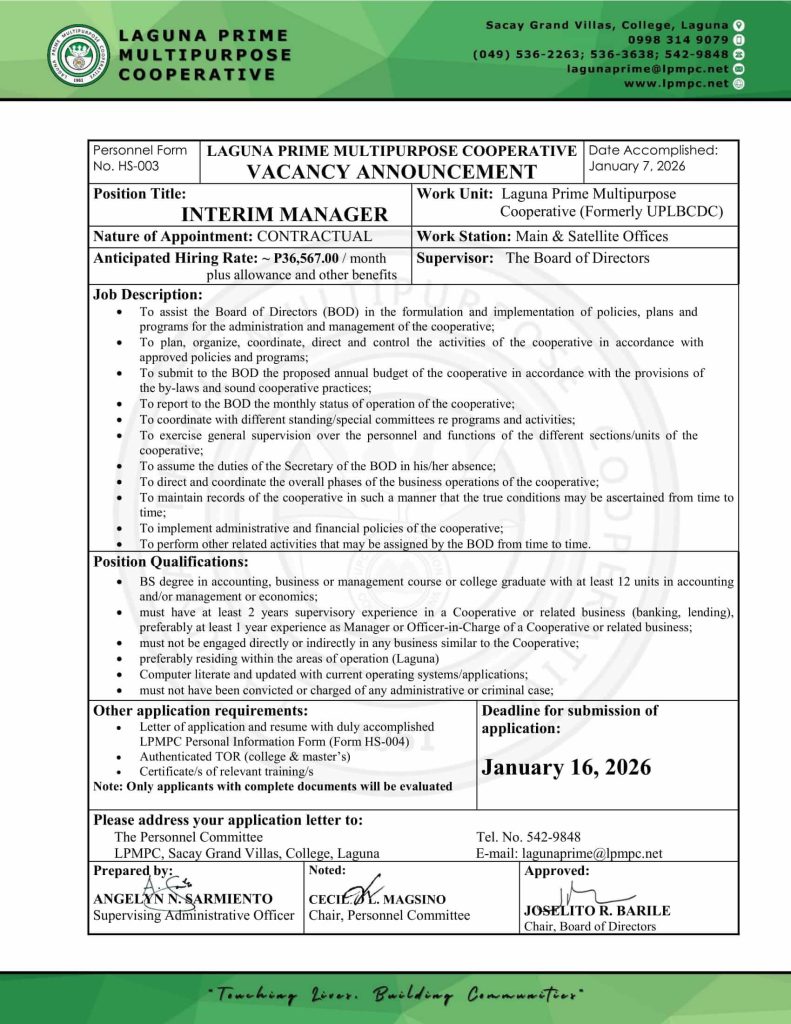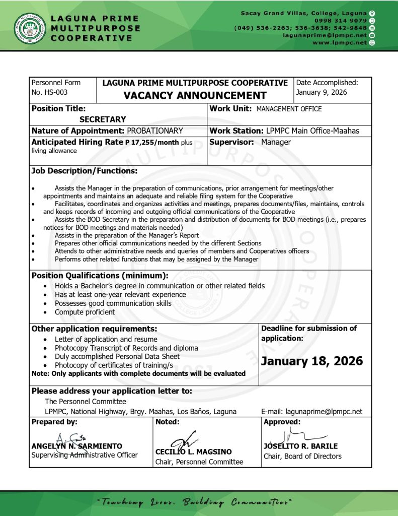 The LPMPC supports the Catholic Women’s League’s Patnubay sa Kalusugan Project on January 11, 2026 (Sunday), from 6:00 a.m. to 11:00 a.m., at the Barangay Batong Malake Covered Court. The blood chemistry package with discounted rates will be shouldered by...