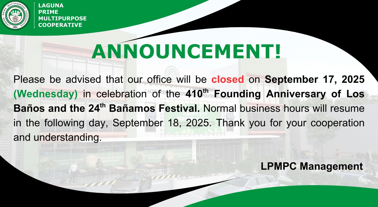 Please be advised that the Laguna Prime Multipurpose Cooperative (LPMPC) office will be closed on September 17, 2025 (Wednesday) in celebration of the 410th Founding Anniversary of Los Baños and the 24th Bañamos Festival. 🎉