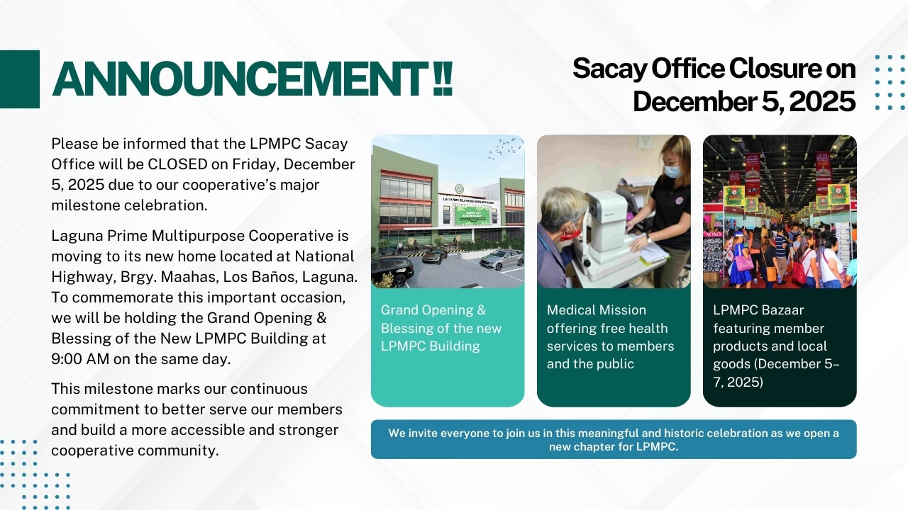 Please be informed that the LPMPC Sacay Office will be CLOSED on Friday, December 5, 2025 due to our cooperative’s major milestone celebration.