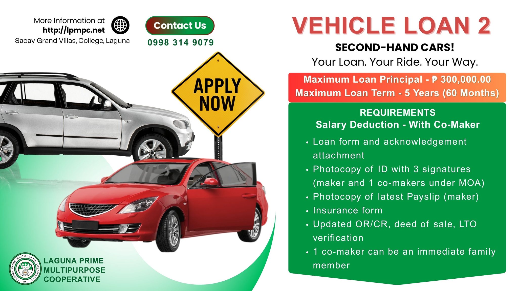 Owning a reliable car doesn’t always mean buying brand new. With Laguna Prime Multipurpose Cooperative’s Vehicle Loan 2, you can now finance second-hand cars with ease and flexible terms. This program is designed to help you purchase pre-owned vehicles while enjoying affordable repayment options.